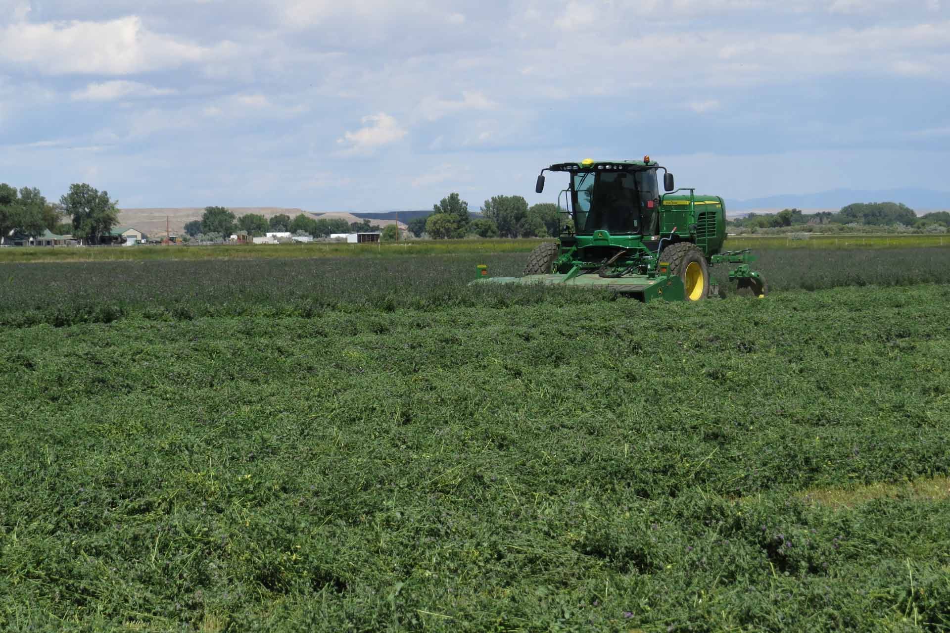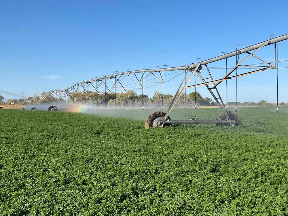 Shield H Farms is primarily in alfalfa production with rotating crops of corn and oats. The farm has one computerized controlled center pivot irrigation system at the Paradise Valley property while the other tracts are irrigated via dams and gated pipe to ensure good, consistent coverage for the alfalfa, grass/alfalfa, row crops, and pasture ground. Three cuttings each summer are the result of our irrigation systems that supply sufficient water, annual fertilization practices, and conscientious insecticide applications. The arid climate with cool evenings, warm days, low humidity, and high altitude of 4,951 feet maximizes the quality of our alfalfa. Shield H Farms offers alfalfa hay for sale year round.